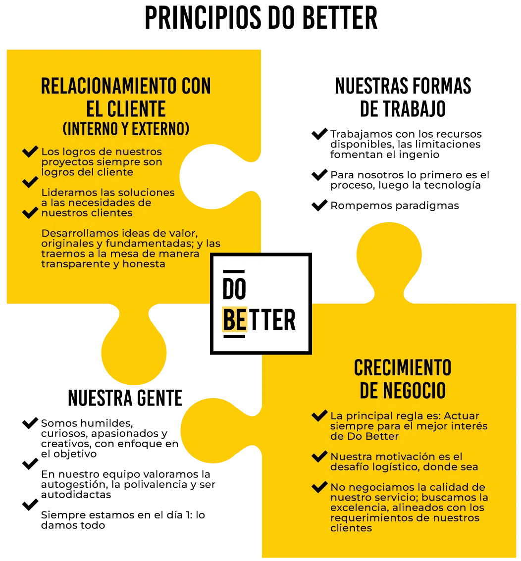 En Do Better no somos una empresa común. Nuestra forma de trabajar nace desde las personas: humildes, creativas, comprometidas y apasionadas por resolver desafíos logísticos de forma distinta.