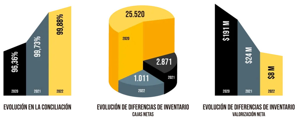 Se redujeron las diferencias físicas de inventario de más de 120.000 cajas diarias a solo 4.000. El indicador de precisión (IRA) alcanzó el 99,90 %, muy por sobre el 96,36 % inicial. También se cerraron bodegas de overflow y se redujeron los costos logísticos por almacenamiento externo.